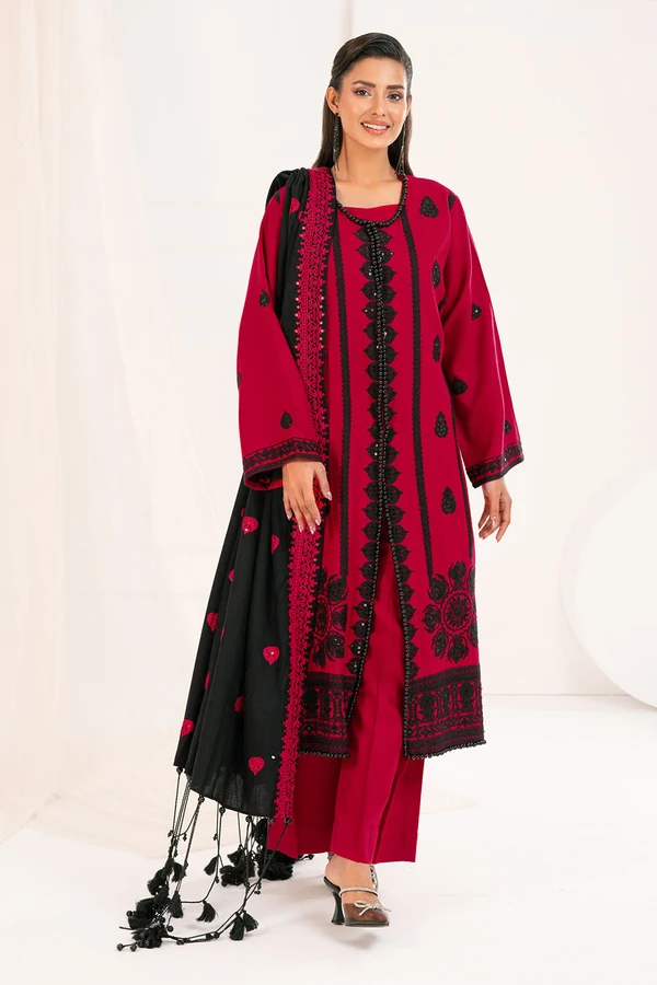 red and black, intricate embroidery, and premium fabric, this outfit is