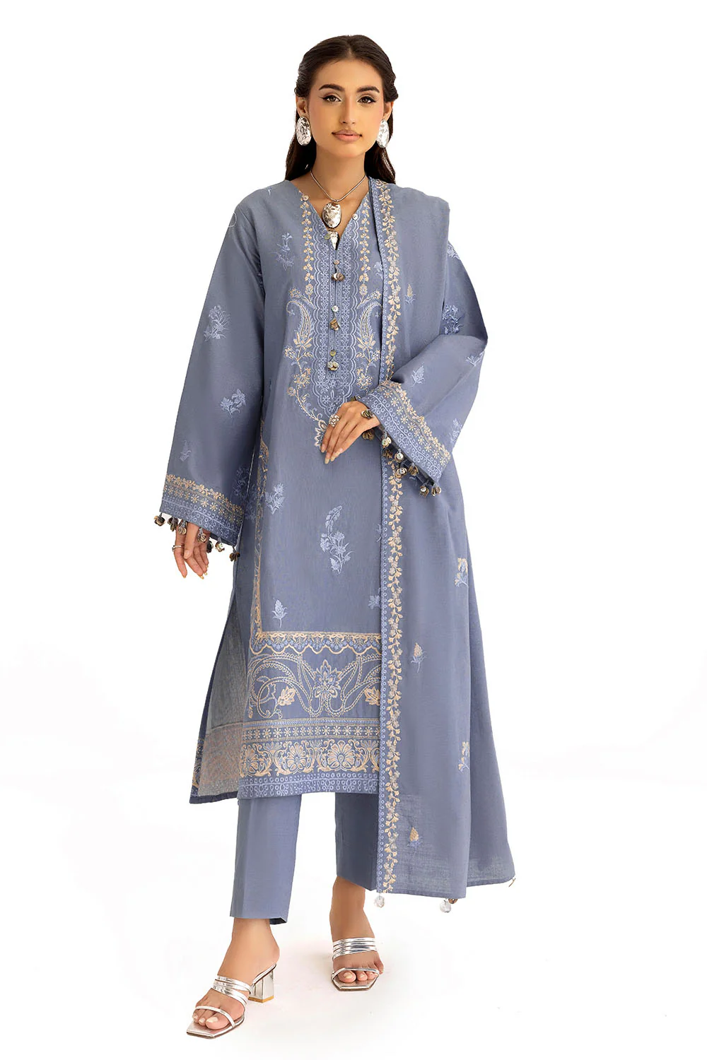 The Gul Ahmed K-52012 design showcases a perfect blend of detailed embroidery, subtle print accents, and a beautifully muted blue-grey color base.
